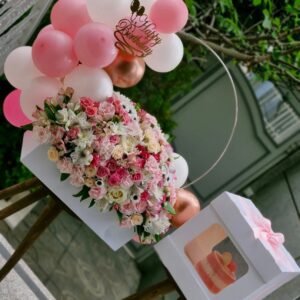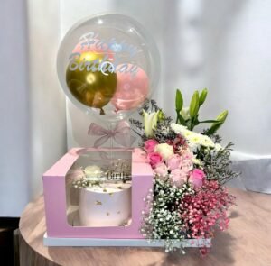 Celebrate life’s sweetest milestones with the enchanting Birthday-Anniversary Hamper T-02863, a delightful fusion of whimsy and elegance from Team14 Gift Shop that floats joy into every celebration! This captivating setup features a shimmering transparent bubble balloon filled with a golden balloon and soft pink accents, elegantly inscribed with “Happy Birthday” for an instant burst of festive cheer, gracefully perched atop a chic pink cake box. Inside, discover a luscious white cake adorned with golden flecks and a heartfelt “Happy Birthday” plaque, surrounded by a romantic cascade of fresh blooms including delicate pink and white roses, graceful lilies, cheerful daisies, and wispy baby’s breath for a fresh, aromatic embrace. Ideal for birthdays, anniversaries, or any moment that calls for a touch of magic, this hamper from Team14 Gift Shop promises to elevate the ordinary into extraordinary with its blend of sweetness, sparkle, and timeless charm!