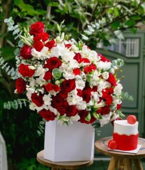 Celebrate passion and elegance with the stunning Birthday-Anniversary Hamper T-174634, a harmonious blend of vibrant florals and sweet indulgence curated by Team14 Gift Shop to make every moment unforgettable! This exquisite arrangement features a bountiful bouquet of lush red roses and pristine white carnations, gracefully intertwined with fresh eucalyptus leaves for a fresh, aromatic touch, all elegantly housed in a sleek white box that exudes modern sophistication. Accompanying it is a delightful mini cake adorned with golden edging and topped with charming red macarons, offering a burst of creamy vanilla goodness and crisp, flavorful bites. Perfect for birthdays, anniversaries, or any romantic celebration, this hamper from Team14 Gift Shop captures the essence of love and joy in every detail.