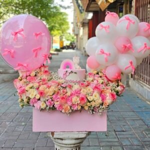 Celebrate the magic of new beginnings with the delightful Birthday-Anniversary Hamper Y-174639, a whimsical hot air balloon-inspired creation from Team14 Gift Shop that soars with joy and sweetness! This enchanting setup features a large transparent bubble balloon filled with three soft pink balloons, personalized with “Zarnab’s first day of school 27.07.25” and “Love is Eternal” for a heartfelt touch, suspended from a sturdy basket adorned with delicate baby’s breath and a bountiful cluster of golden Ferrero Rocher chocolates, all tied with a luxurious pink ribbon in an elegant pink box. Complementing this aerial delight is a charming heart-shaped pink cake, beautifully piped with “Happy Birthday Panda” in swirling white icing and delicate lace-like borders, promising a fluffy vanilla delight that melts in the mouth. Ideal for marking first school days, birthdays, or anniversaries with a burst of excitement and affection, this hamper from Team14 Gift Shop turns every milestone into an unforgettable adventure!