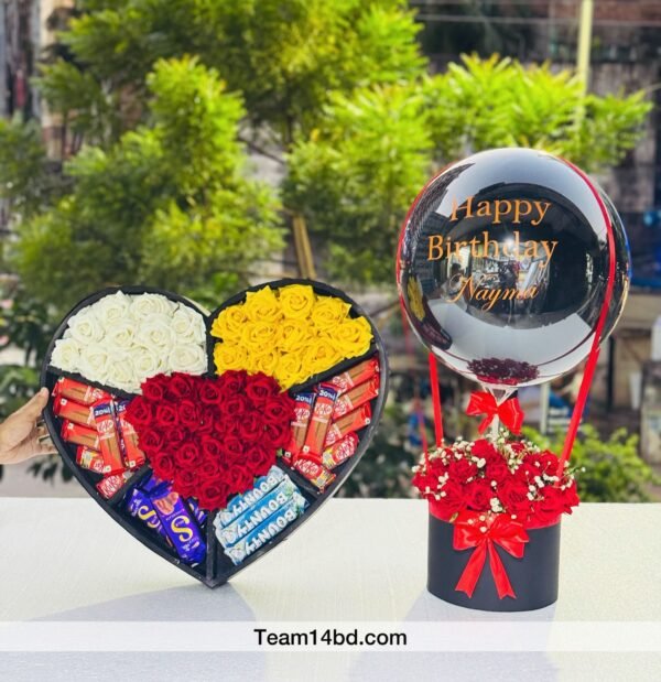 Ignite the passion of unforgettable moments with the captivating Birthday-Anniversary Hamper T-62836, a bold fusion of floral artistry and sweet indulgence masterfully designed by Team14 Gift Shop to declare love in every vibrant hue! This striking heart-shaped black box bursts with a symphony of preserved roses in classic white, sunny yellow, and fiery red, meticulously arranged in quadrants that frame generous pockets of beloved chocolates like KitKat, Cadbury, Bounty, Snickers, and more, creating a romantic mosaic that’s as visually stunning as it is delectably tempting. Hovering gracefully above is a sleek black bubble balloon emblazoned with “Happy Birthday Nayma” in elegant gold script, adding a whimsical, elevated touch of celebration that draws the eye and heart. Grounding the ensemble is a petite black box overflowing with a cluster of fresh red roses and delicate baby’s breath, tied with a bold red ribbon for that final flourish of timeless allure. Perfect for birthdays, anniversaries, or any declaration of devotion, this hamper from Team14 Gift Shop transforms ordinary gestures into extraordinary expressions of affection and joy!