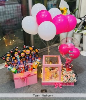 Discover the thrill of playful indulgence with the vibrant Birthday-Anniversary Hamper T-73638, a dazzling explosion of snacks and sparkle handcrafted by Team14 Gift Shop to turn any celebration into a crunchy, sweet adventure! This eye-catching pink box overflows with a treasure trove of treats, including crispy Lay’s chips in classic flavors, indulgent Cadbury and Dairy Milk chocolates, fun Twix and Snickers bars, colorful Pringles cans, refreshing canned drinks, and more, all artfully arranged like a bouquet of joy with twinkling fairy lights adding a magical glow from within. Crowning the delight is a heart-shaped clear bubble balloon filled with soft pink balloons, elegantly scripted with “Happy Birthday Meem” for that personal pop of festivity, while a cluster of white and pink balloons floats nearby for extra whimsy. Nestled at the base, a petite arrangement of fresh lilies, roses, and baby’s breath in a matching pink box brings a touch of elegant romance to the savory symphony. Perfect for birthdays, anniversaries, or surprise snack attacks, this hamper from Team14 Gift Shop delivers non-stop fun and flavor in every bite and bloom!