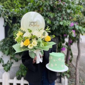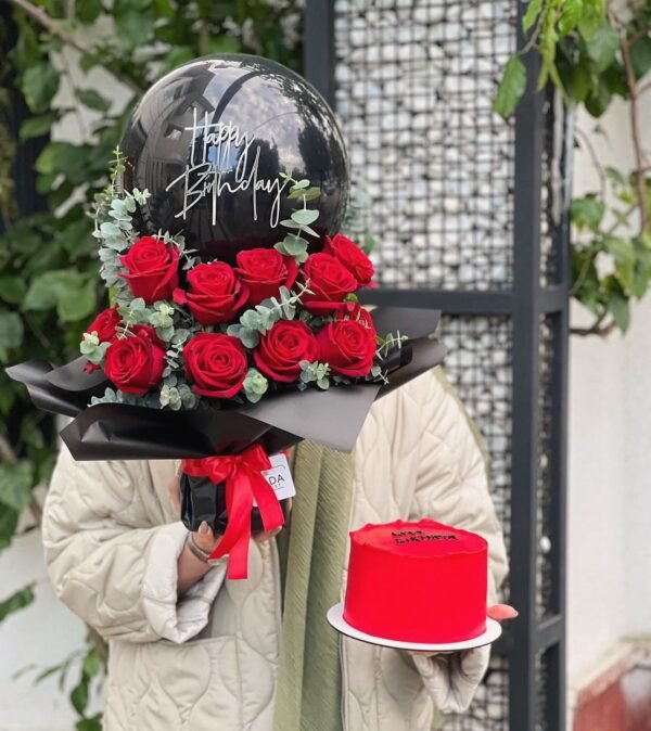 Ignite passion with the dramatic Birthday-Anniversary Hamper T-74669, a bold statement of romance and celebration masterfully curated by Team14 Gift Shop to make hearts race and moments unforgettable! This striking ensemble features a sleek black bubble balloon boldly inscribed with “Happy Birthday” in elegant silver script, floating like a midnight promise above a lush bouquet of vibrant red roses intertwined with aromatic eucalyptus leaves, all wrapped in sophisticated black paper and secured with a classic red ribbon for an air of mysterious allure. Complementing the floral intensity is a decadent red velvet cake, its glossy crimson surface etched with a personalized message, offering layers of rich, velvety indulgence that’s as intense as the love it represents. Perfect for birthdays, anniversaries, or any occasion that demands a touch of fiery elegance, this hamper from Team14 Gift Shop fuses balloon drama, petal passion, and cakey decadence into a gift that commands attention and steals breaths!