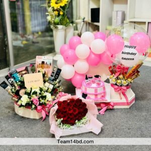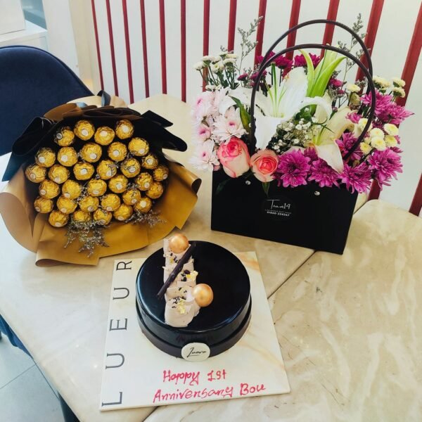 Cherish the romance of enduring love with the exquisite Birthday-Anniversary Hamper T-93736, a sophisticated symphony of indulgence and elegance handcrafted by Team14 Gift Shop to honor every cherished milestone! This luxurious trio begins with a bountiful Ferrero Rocher bouquet, featuring a generous cluster of golden hazelnut chocolates artfully arranged and wrapped in sleek black and gold tissue, evoking pure temptation with its rich, nutty allure. Beside it blooms a stunning floral handbag in chic black, overflowing with fresh white lilies, delicate pink and peach roses, vibrant purple chrysanthemums, and soft white fillers for a fragrant, opulent cascade that’s as stylish as it is sentimental. At the center, a decadent black chocolate cake with golden accents and creamy mousse layers sits proudly, customizable with a personalized anniversary message to add that intimate touch. Perfect for birthdays, anniversaries, or whispers of “forever,” this hamper from Team14 Gift Shop fuses floral grace, chocolate decadence, and cakey sophistication into a gift that speaks volumes of affection!