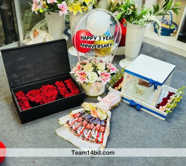 Savor the timeless romance of three cherished years with the enchanting Birthday-Anniversary-Valentine Hamper T-83638, a heartfelt collection of elegance and indulgence lovingly assembled by Team14 Gift Shop to toast enduring love! This captivating set opens with a sleek black box brimming with a lush cascade of vibrant red roses, symbolizing passion and devotion in every velvety petal. Nearby blooms a graceful bouquet of pristine white lilies, soft pink roses, and delicate fillers in a charming white pot, offering a fresh, aromatic whisper of purity and affection. Adding a sweet serenade is an exquisite chocolate bouquet featuring premium Twix, Snickers, and KitKat bars wrapped in golden ribbons, ready to melt hearts and taste buds alike. Elevating the joy is a shimmering clear bubble balloon cradling a bold red and gold orb inscribed with “Happy 3 Year Anniversary,” infusing the air with celebratory sparkle. Tucked elegantly is a pristine white gift box tied with a blue bow, unveiling a delicate butterfly brooch and sentimental trinkets for that personal, sparkling touch. Perfect for birthdays, anniversaries, Valentine’s Day, or reaffirming your bond, this hamper from Team14 Gift Shop weaves floral beauty, chocolate temptation, and whimsical flair into a tribute that celebrates love’s beautiful journey!