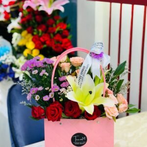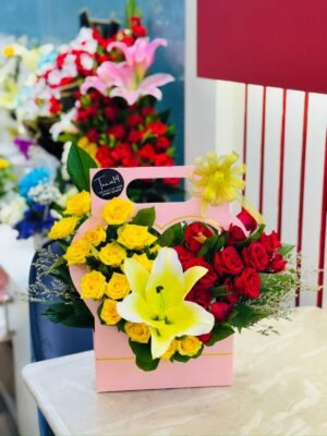 Illuminate life’s beautiful contrasts with the captivating Flower Bag T14-04793, a harmonious dance of sunshine and passion expertly crafted by Team14 Gift Shop to evoke joy and deep emotion in every petal! This delightful pink handbag bursts with a vibrant medley of fresh blooms, featuring cheerful yellow roses symbolizing friendship and warmth, elegant yellow lilies for renewed hope and prosperity, and passionate red roses whispering undying love and desire, all gracefully intertwined with subtle greenery and wispy fillers for a fresh, aromatic balance that’s as uplifting as it is romantic. Adorned with a sparkling gold ribbon bow and nestled in our signature pink bag for easy carrying, this arrangement arrives ready to turn heads and touch hearts, filling any space with natural fragrance and effortless allure. Ideal for birthdays, anniversaries, or gestures that blend light-hearted fun with heartfelt devotion, this creation from Team14 Gift Shop transforms simple surprises into floral symphonies of color and sentiment!