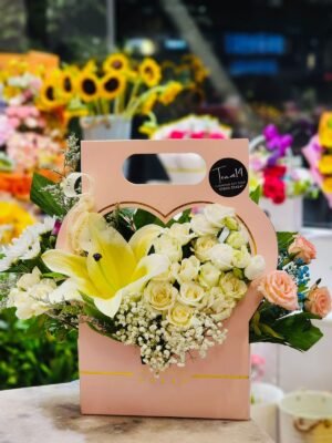 Evoke pure tenderness with the heartfelt Flower Bag T14-047963, a whimsical expression of affection thoughtfully assembled by Team14 Gift Shop to say “Just Because You” in the most delightful way! This charming pink handbag, shaped like a loving heart with golden accents, blooms with a soft, romantic arrangement of fresh white lilies symbolizing humility and devotion, pristine white roses for innocent love and unity, delicate peach roses adding a blush of appreciation, cheerful daisies for loyal friendship, and subtle blue accents for serenity, all intertwined with lush greenery and wispy baby’s breath for a fresh, aromatic embrace that’s as gentle as a whisper. Adorned with a flowing white ribbon and our signature emblem, this bag arrives ready to carry joy and surprise, filling any moment with natural fragrance and timeless charm. Ideal for birthdays, anniversaries, or spontaneous gestures of love, this creation from Team14 Gift Shop turns everyday thoughts into floral poetry that touches the soul!