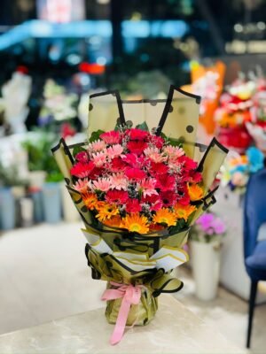 In stock									Illuminate your space with the vibrant Flower Bouquet T14-0472, a radiant burst of color and cheer expertly handcrafted by Team14 Gift Shop to infuse every moment with sunny optimism and playful energy! This lively wrap showcases a dazzling array of gerbera daisies in a spectrum of warm hues—from soft pink and bold magenta to fiery red and sunny orange—each petal unfurling like a smile, accented with lush greenery for a fresh, invigorating contrast that’s perfect for lifting spirits and sparking conversations. Nestled in textured gold paper with chic black polka dots and secured with a delicate pink ribbon, this bouquet arrives brimming with natural fragrance and effortless style, making it an instant mood booster for any setting. Ideal for birthdays, anniversaries, or just because gestures that celebrate life’s colorful side, this creation from Team14 Gift Shop turns simple appreciation into a festival of blooms that delights the senses and warms the heart!