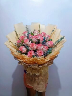 Embrace the blush of gentle romance with the enchanting Flower Bouquet T14-04724, a soft cascade of affection thoughtfully arranged by Team14 Gift Shop to whisper sweet sentiments in every petal! This delightful wrap bursts with a bountiful cluster of fresh pink roses, each velvety bloom symbolizing admiration and grace, elegantly intertwined with aromatic eucalyptus leaves and subtle lavender fillers for a fresh, textured embrace that’s as romantic as it is rejuvenating. Nestled in crisp beige tissue paper and secured with a luxurious gold ribbon bow, this bouquet arrives ready to captivate, filling the air with natural fragrance and turning any moment into a tender celebration of love. Ideal for birthdays, anniversaries, or simply expressing heartfelt appreciation, this creation from Team14 Gift Shop captures the essence of floral elegance in a gift that’s as timeless as it is touching!