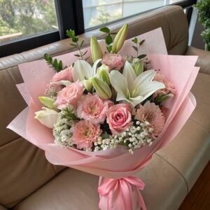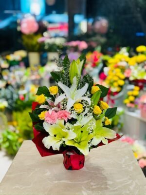 Radiate joy and vitality with the vibrant Flower Bouquet T14-047923, a colorful explosion of freshness and charm handcrafted by Team14 Gift Shop to brighten any occasion with a burst of life’s energy! This lively arrangement features cheerful yellow roses symbolizing friendship and optimism, elegant white and yellow lilies evoking purity and renewal, soft pink carnations adding a touch of admiration and grace, all gracefully intertwined with lush greenery and delicate baby’s breath for a fresh, aromatic embrace that’s as uplifting as it is enchanting. Nestled in a striking red patterned vase with subtle accents, this bouquet arrives ready to captivate, filling the air with natural fragrance and turning every space into a garden of delight. Ideal for birthdays, anniversaries, or simply celebrating the beauty of the moment, this creation from Team14 Gift Shop blends bold hues and tender blooms into a gift that speaks volumes of happiness and warmth!
