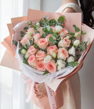 “Flower Bouquet T14-047923,” featuring an elegant arrangement of soft pink roses and white blooms accented with lush green eucalyptus leaves, wrapped in delicate white paper with a blush pink outer layer and a “LOVE” ribbon. Held gracefully by a model, this romantic floral gift from Team14 Shops is perfect for expressing affection on anniversaries, Valentine’s Day, or any heartfelt moment.