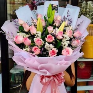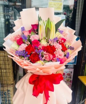 A stunning creation, the Flower Bouquet T14-047925 from Team14 Shop bursts with passionate hues of red, pink, and purple. This romantic arrangement features red carnations, pink roses, creamy white blooms, and elegant white lilies, accented with lavender fillers and fresh green leaves. Wrapped beautifully in soft peach and white tissue paper and finished with a bold red satin ribbon, it’s a perfect gift to express deep love and admiration — ideal for anniversaries, birthdays, or Valentine’s Day surprises.