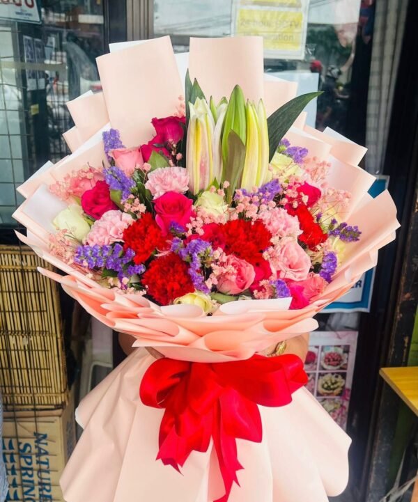 A stunning creation, the Flower Bouquet T14-047925 from Team14 Shop bursts with passionate hues of red, pink, and purple. This romantic arrangement features red carnations, pink roses, creamy white blooms, and elegant white lilies, accented with lavender fillers and fresh green leaves. Wrapped beautifully in soft peach and white tissue paper and finished with a bold red satin ribbon, it’s a perfect gift to express deep love and admiration — ideal for anniversaries, birthdays, or Valentine’s Day surprises.