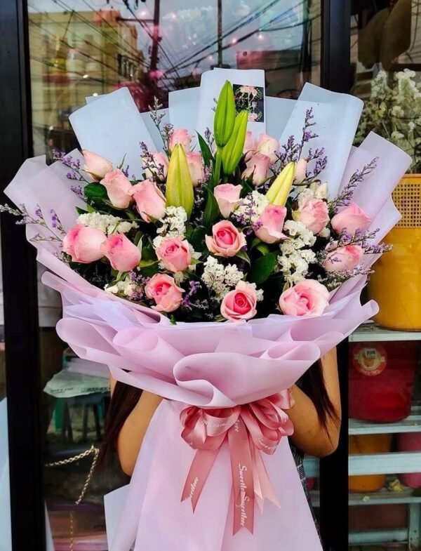 A romantic bouquet labeled “Flower Bouquet T14-0479315” blooms with delicate pink roses and graceful white lilies, enhanced by soft lavender accents, wispy white fillers, and fresh green foliage. Gently wrapped in layers of white and pink tissue paper and finished with a sweet pink “SWEET LOVE” ribbon, this tender floral gift from Team14 Shop is perfect for anniversaries, Valentine’s Day surprises, or conveying gentle affection with timeless elegance.