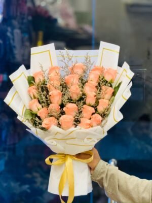 A delightful bouquet labeled “Flower Bouquet T14-047934” features a stunning collection of peach-colored roses, complemented by delicate green foliage and wispy fillers. Wrapped in elegant white paper with golden accents and tied with a matching yellow ribbon, this charming floral gift from Team14 Shop is perfect for birthdays, thank-you gestures, or bringing a touch of warmth to any occasion.