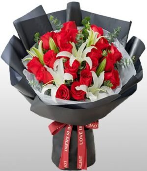 A striking bouquet labeled “Flower Bouquet T14-047934” showcases a bold arrangement of vibrant red roses and elegant white lilies, complemented by lush green eucalyptus leaves. Wrapped in sleek black paper with a white inner layer and tied with a red “LOVE IS SILENT” ribbon, this sophisticated floral gift from Team14 Shop is perfect for expressing deep affection, making it an ideal choice for anniversaries, romantic gestures, or special celebrations.