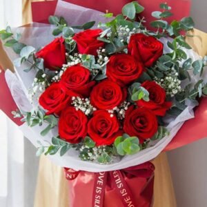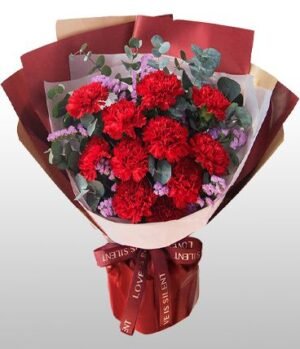A vibrant bouquet labeled “Flower Bouquet T14-047934” features a rich arrangement of deep red carnations, accented with soft purple blooms and lush green eucalyptus leaves. Wrapped in white paper with a striking burgundy outer layer and tied with a matching “LOVE IS SILENT” ribbon, this elegant floral gift from Team14 Shop is perfect for conveying love and admiration, making it an excellent choice for anniversaries, romantic surprises, or heartfelt gestures.