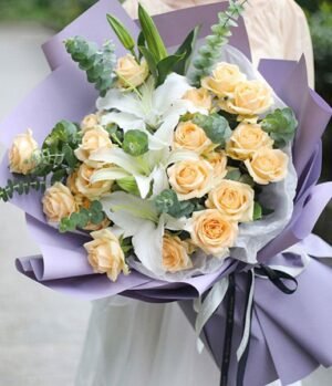 A graceful bouquet labeled “Flower Bouquet T14-047934” showcases a harmonious blend of soft peach roses and pristine white lilies, enhanced by vibrant green eucalyptus leaves. Encased in delicate white paper with a soothing lavender outer layer and tied with a subtle black ribbon, this refined floral gift from Team14 Shop is ideal for celebrations, expressions of appreciation, or adding elegance to any occasion.