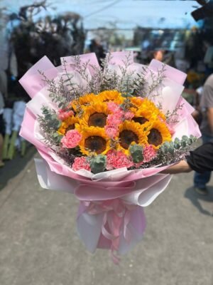 A cheerful bouquet labeled “Flower Bouquet T14-047935” bursts with vibrant yellow and pink sunflowers, accented by soft pink carnations and lush green eucalyptus leaves. Thoughtfully wrapped in white paper with delicate pink outer layers and tied with a matching pink ribbon, this sunny floral gift from Team14 Shop is ideal for brightening birthdays, sending get-well wishes, or celebrating everyday joys with a pop of color and positivity.