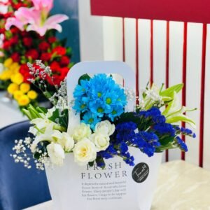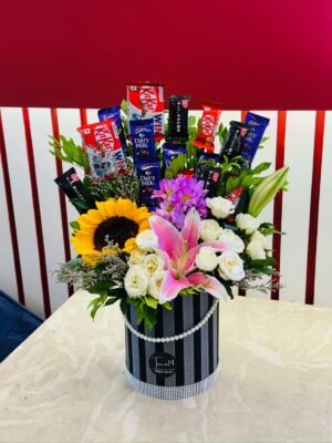 Unleash a symphony of sweetness and sunshine with the enchanting Flower & Chocolate Box T14-0479, a luxurious fusion of floral elegance and indulgent treats masterfully curated by Team14 Gift Shop to delight the senses and warm the heart! This stunning striped black-and-white pearl-adorned vase overflows with a vibrant bouquet of cheerful sunflowers symbolizing unwavering loyalty and joy, graceful pink lilies evoking renewed passion, pristine white roses for pure affection, and delicate purple orchids adding a touch of exotic mystery, all intertwined with lush greenery and baby’s breath for a fresh, aromatic cascade that’s as visually captivating as it is fragrant. Nestled artfully among the blooms is a tempting array of premium chocolates, including creamy Cadbury Dairy Milk bars, crispy KitKat fingers, indulgent Snickers, and more, each wrapped in festive foils that promise crunchy, melty bliss with every bite. Perfect for birthdays, anniversaries, or any occasion that calls for a burst of happiness and romance, this hamper from Team14 Gift Shop blends petal-perfect beauty with chocolatey temptation into a gift that’s sure to create lasting smiles and sweet memories!