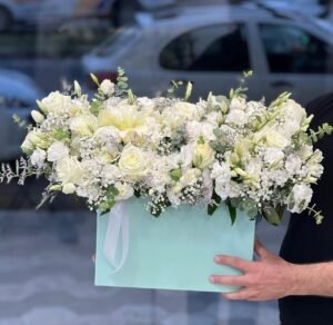 Immerse in the ethereal beauty of timeless purity with the luxurious Flower Box T14-0479, a stunning cascade of serenity and grace handcrafted by Team14 Gift Shop to evoke peace and elegance in every petal! This exquisite mint-green box overflows with a delicate symphony of fresh white blooms, including pristine white roses symbolizing innocent love and unity, graceful white lilies for renewed hope and devotion, soft white carnations adding a touch of admiration, and airy baby’s breath for whimsical lightness, all artfully intertwined with lush eucalyptus and subtle greenery for a fresh, aromatic veil that’s as soothing as it is sophisticated. Tied with a flowing white satin ribbon for that perfect finishing touch, this arrangement arrives ready to transform any space into a tranquil oasis, filling the air with subtle fragrance and effortless luxury. Ideal for birthdays, anniversaries, or gifting a moment of calm elegance, this creation from Team14 Gift Shop blends floral finesse and heartfelt serenity into a gift that whispers “forever cherished”!